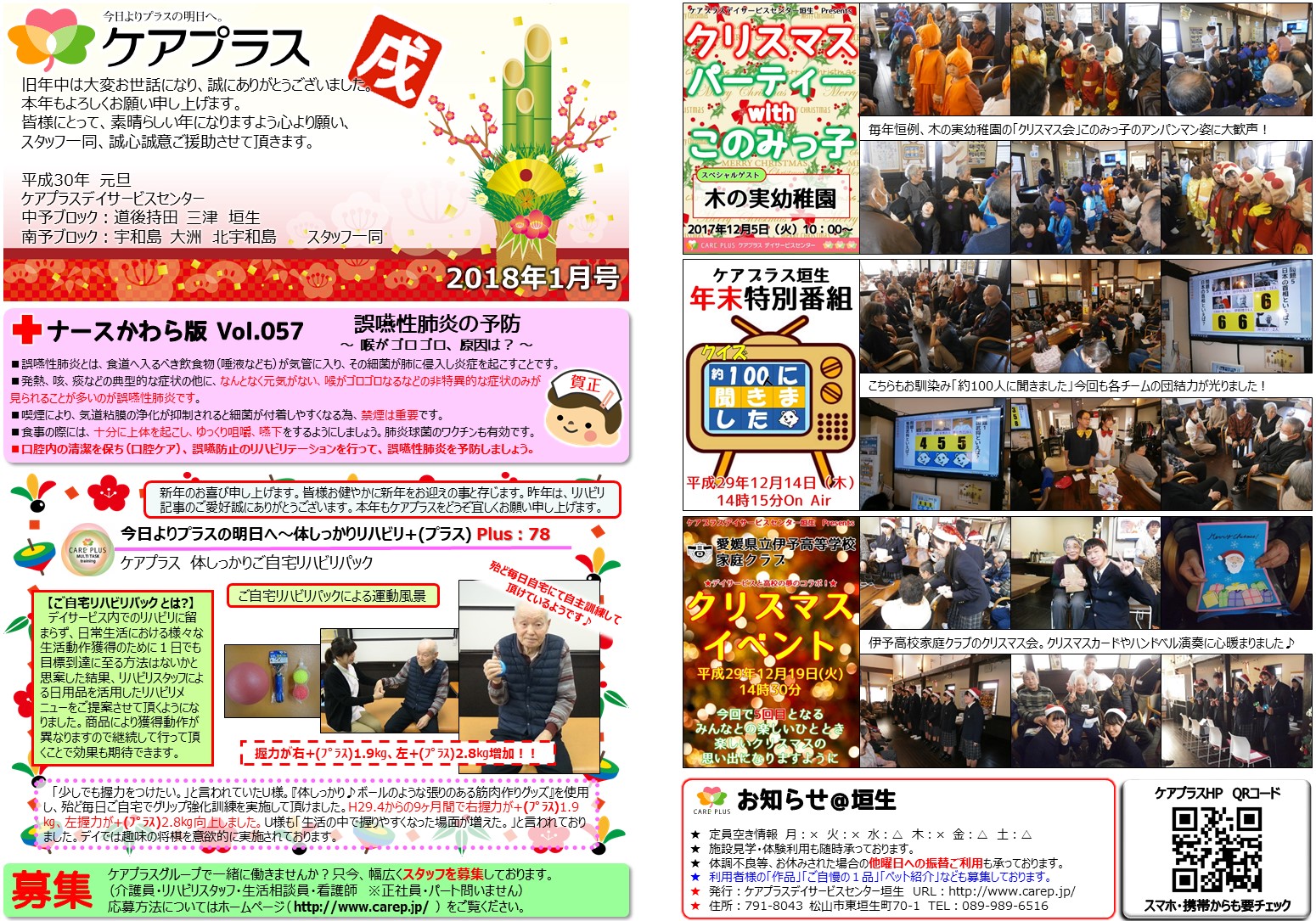 1月号の新聞には12月中に行われた3件のイベントの写真が満載されています。12月のケアプラス垣生は、まさにイベント月間!様々なイベントが行われ、ご利用者様に楽しんでいただけたものと思われますが、全てのイベント写真を載せられないのが残念です。詳細はスタッフのブログで紹介しておりますので、そちらをご覧下さいませ。