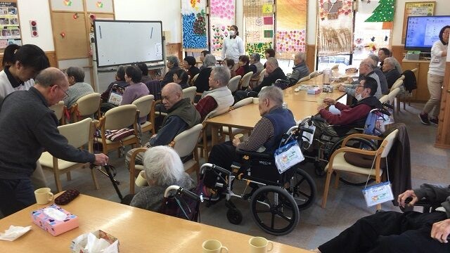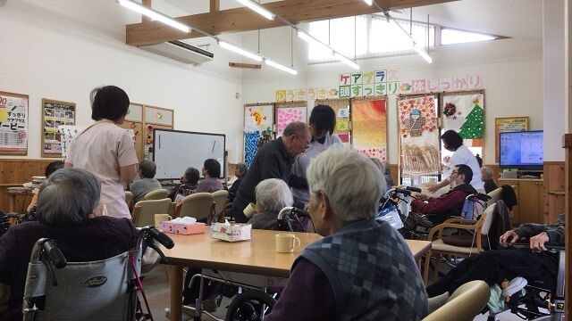 ケアプラス三津では車椅子を使われる利用者様も含め、全利用者様が足を動かして行えるリハビリ体操やレクリエーションも組み込み、ご利用時間内を過ごしていただいています。