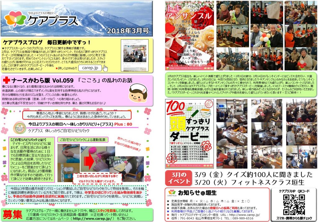 さて、今回はケアプラス垣生新聞2018年3月号の紹介をします。今回も2月中に行われたイベントの写真が沢山載っていますよ!