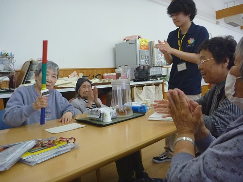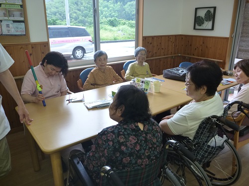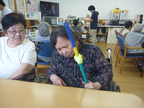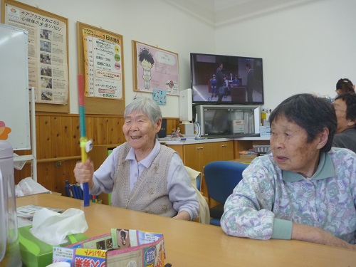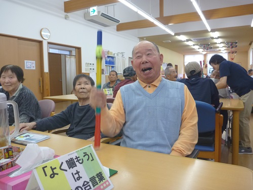 今回は「フリフリ棒」というレクリエーションを行いました。棒に万歩計を付けて、チームに分かれて1人ずつ棒を振って合計数を競い合います。