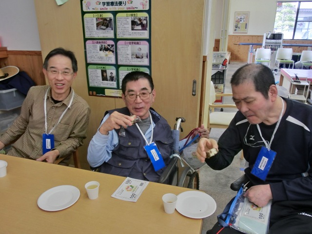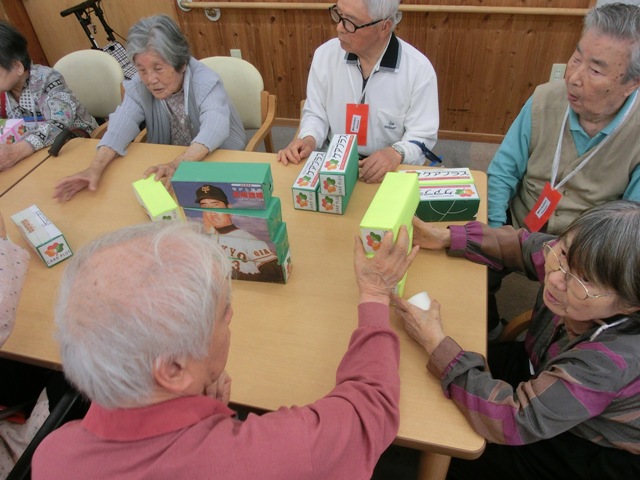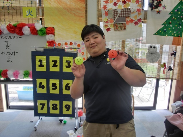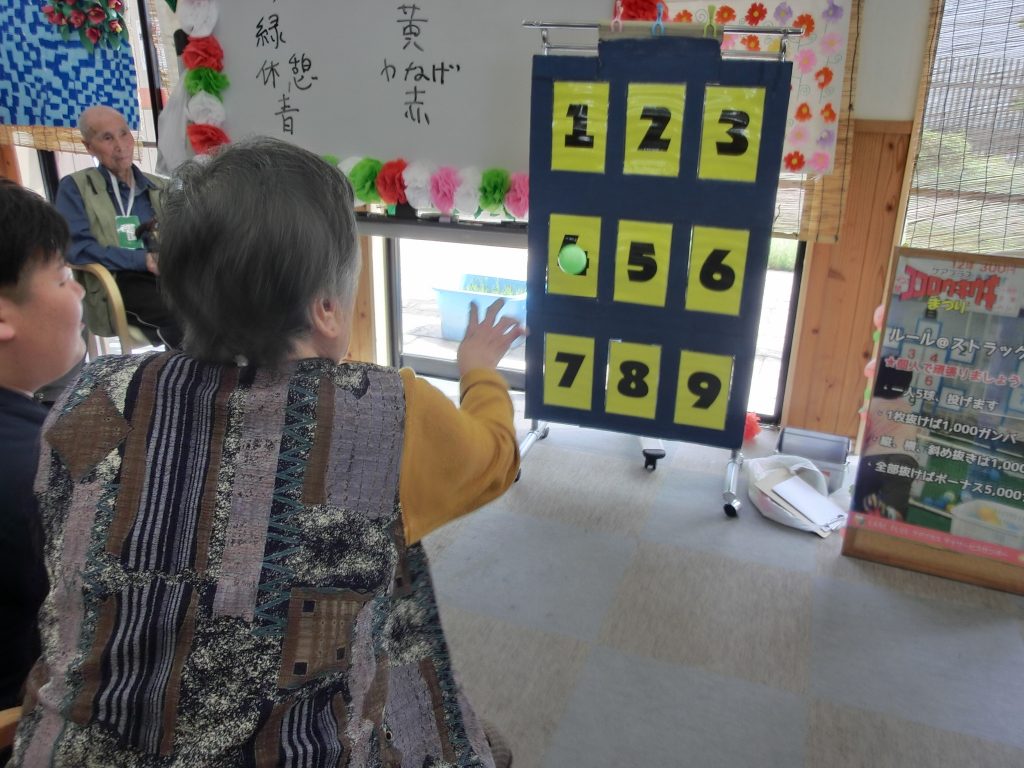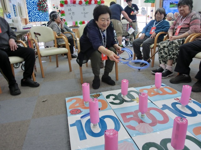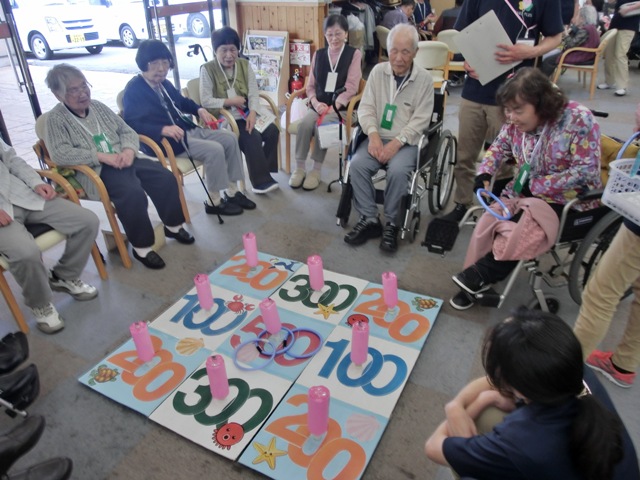 2つ目のブースは『輪投げ』になります。中心に500点の高得点があり周りに200、300点のピンが配置されています。一人5投用意されていて輪っかが得点のピンに入ればOKというお馴染みのルールで行いました。リハビリでも輪投げをされている方がおり、なんと5投中4投も500点に入れ高得点をたたき出しましたヽ(´▽`)/