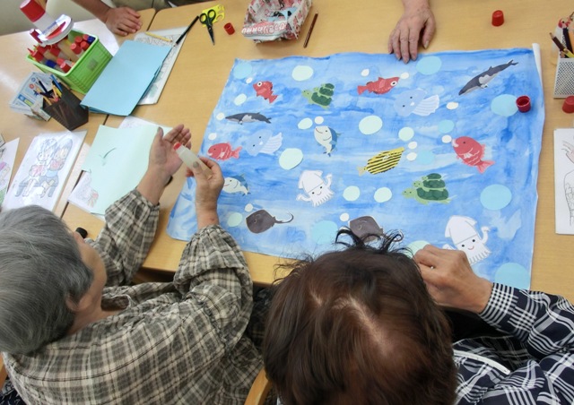 花火の飾り以外にも爽やかな夏を感じて頂こうと、海の絵の壁飾りも作成して頂きました。魚や泡の配置をあ~でもないこ~でもないと周りの人と話し合いながら貼っていき、とっても爽やかな絵が完成しました♪