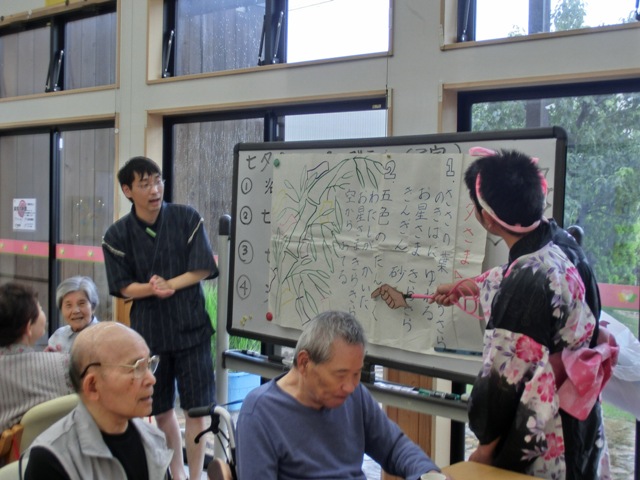 今年はあいにくの悪天候で夜空の織姫と彦星との逢瀬は難しかったですが、ケアプラス三津では藤目介護員による織姫と福住機能訓練士による彦星が登場しました(*^▽^*)