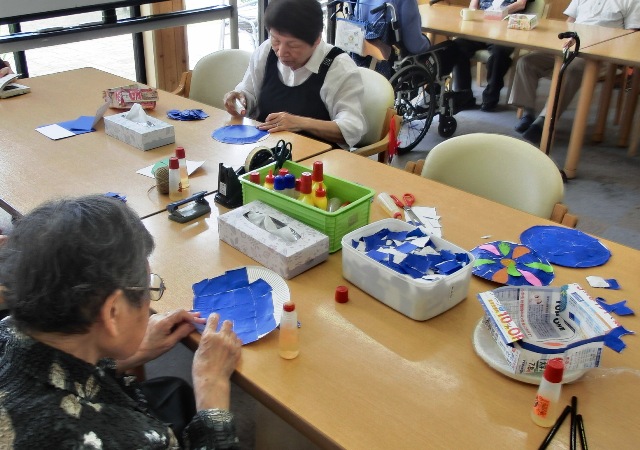さて梅雨が明けましたので、ケアプラス三津も模様替えを行いました。飾っていた紫陽花を花火の飾りに変更しました。青い折り紙を貼った紙皿に雫型の折り紙を円状に貼ったシンプルな工程ですので、色んなご利用者様が制作に携わって下さいました♪
