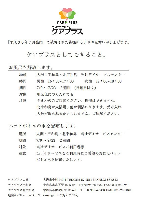 そこで今回、被災された皆様へ『ケアプラスとしてできる事』として、7/23までの間、お風呂の一般開放を行っていますが、ご存じでない方もおられると思い、ブログより発信させて頂きます。該当事業所は大洲・宇和島・北宇和島のケアプラスデイサービスセンターです。