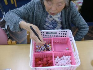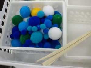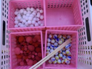 ビー玉をつかむことが難しい方は、フェルトで出来た玉をつかむ練習をしております。フェルト玉はふわふわしていてお箸でつまみやすいです。そこで練習をしてビー玉等に挑戦する人もいます。