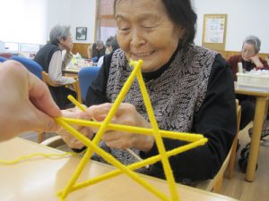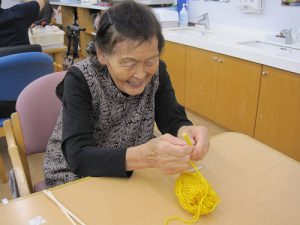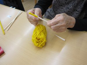 まず、最初は黄色の毛糸を使った創作活動です。ステキな笑顔で作られておりますが、さてこの毛糸がどうなるのでしょうか?