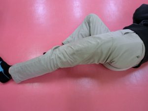 これらが終わったら、横向きの姿勢を取ります。床面に接している方の膝を軽く曲げて、上にある足は膝を真っ直ぐに伸ばします。その状態で伸ばした方の足を天井に向かってゆっくりと上げて行きます。そのままの姿勢を保ったまま5秒数えてゆっくりと足を下ろします。これを5回繰り返したら、横向きの姿勢を反対にして、同じように行っていきます。