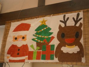 最後に、ご利用者様方が作成した作品の紹介です。まずは貼り絵。12月のホールを飾ったのはサンタさんとトナカイです。綺麗な仕上がりですね。