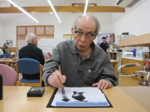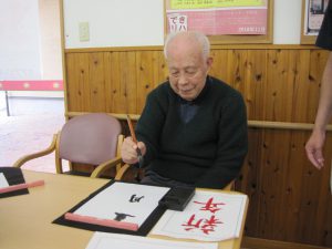 昔、書道をされていた方もおられ「懐かしいな」「今は綺麗に書けんけどな」等と会話も弾み、思い思いの文字を書かれていました。