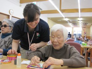 レクリエーションでは、今年の干支「亥」の文字を昨年100歳を迎えられたご利用者様に書いていただき、それを使用し壁飾りを作成しました。
