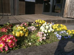 ケアプラス垣生の中でも外でも、春のお花で模様替え♪