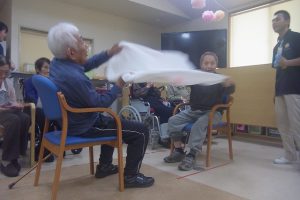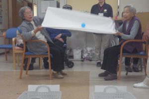 このゲームは2人1組でバスタオルの両端を持ち