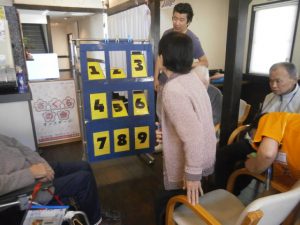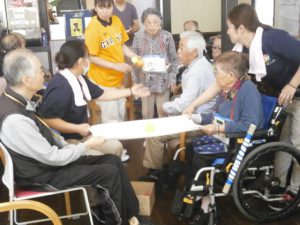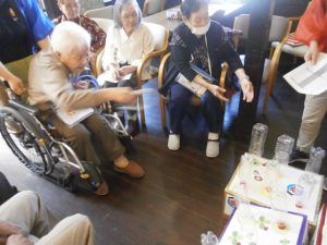 思った所に輪が飛ばず、皆様、苦戦されておりました。「なかなか入らんもんやなぁ。」と、口々に言われていましたが、輪投げの棒(ペットボトル)が輪が当たった衝撃で吹っ飛び、爆笑も沸き起こっていました。