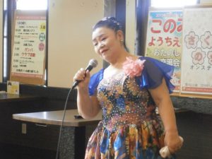 今回は7名の方々が来訪して下さり、松山さくらさんの歌謡『羽田発七時五十分』から公演スタート。艶やかなドレス姿に皆様、うっとりと見惚れていらっしゃいました。