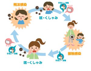 予防としては、飛沫観戦なので手洗いうがいやマスク着用を行いましょう。