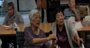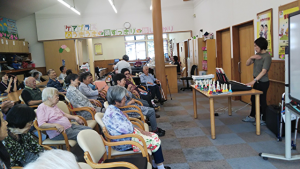 今回は秋らしい曲を大合唱してもらいました。まず一曲目は「五夜お月さん」を皆さんで大合唱してもらいました。歌い終わると皆さん「月は昔は綺麗に見えよったなー」と懐かしんでおりました。