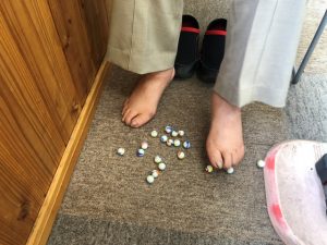 また、ビー玉を利用して膝痛予防運動も実施しています。足底の感覚を向上する事で歩行能力向上を図っています。