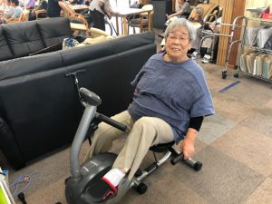 下肢筋力強化を行い膝関節の負担軽減を行うためエアロバクエクササイズを実施しています。