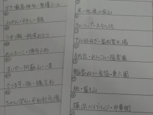 ヒントには、有名な観光地や特産品などが書いてあり、ご利用者様から「○○には行った事あるんよ」「○○って聞いたことはあるんやけど、どこじゃったかなぁ?」と皆様の思い出話も聞きながら、楽しく一生懸命考えられておりました。