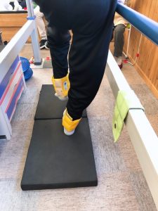 つま先立ち、片足立ち、前後左右のスイングなど不安定なバランスパッドの上での訓練を中心に行っております。