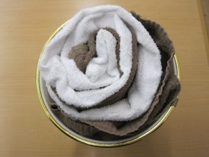 季節的に空気も乾燥してきます。冬の室内最適温湿度、皆さんご存知かとは思いますが、温度は20度以上、湿度を50~60%程度に保つことでインフルエンザウイルスの活動を抑える事が出来るそうです。これからのシーズンには欠かせない、加湿器や室内に濡れたタオルを引っ掛けたりしてのエコ加湿を行う事で湿度を上げることが出来ますね。遊び心で水をバケツに入れて、その中に形を作ったタオルを付け込んでみました。