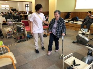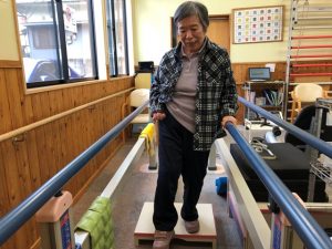 普段デイサービス内は車椅子で移動されているこちらの利用者様のリハビリ風景をご紹介させていただきます。