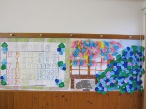 ケアプラス宇和島でも前月皆さんで作ったちぎり絵カレンダーにキレイな紫陽花が咲き誇っています。