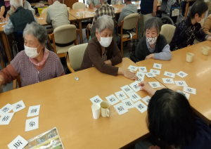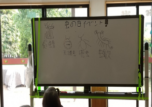 今回は普段目にする昆虫などを漢字表記にした「昆虫かるた」を行いました。中にはわかりにくい漢字もあり、その際には私の方でヒントとして絵をかくのですが、「ますます難しいなー」と大爆笑!そんなやり取りの合間にも話し合いが行われ、無事完成♪頭をすっきりさせて虫の日イベントを楽しんでいただきました。