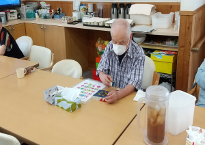 ケアプラス三津では、モーニングガンバタイムの朝の時間に貼り絵や塗り絵や脳トレの教材などを使い、皆さん談笑されながら取り組まれています。