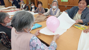 朝の送迎途中から「今日はどんなことするんだろう?」とワクワクしながらスタート。今回は風船を使ったゲーム2つを行いました。まず1つ目に行ったゲームは風船を隣の人に送りながら風船に書いてある数字を読み取って頂き、最後に書いてある数字を皆さんで答えていただきました。皆さん風船を送りながら数字を教えながら大盛り上がりで終えることができました。