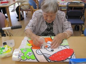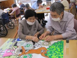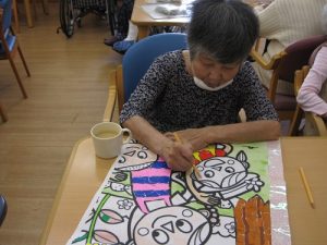 細かな作業ですが、手先のリハビリとして皆さん熱心にされています。中には「今月は何の絵にするの?」「カレンダーはまだ?」と楽しみにされている方もいます。