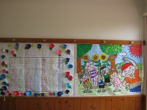 カレンダーの周りにはこれからが見頃の朝顔をちりばめて、華やかにしました。この朝顔も皆さんで制作して頂きました。張り出してみると、制作して頂いた方から、「ここは私がやったところやない?」と完成した絵を見て笑顔でお話しされています。