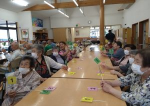 まず、最初に紹介させていただくイベントは、「七夕イベント」です。七夕といえば短冊ということで、一週間前から皆様に色とりどりの短冊に願い事を書いたり、七夕の飾りつけをガンバクラブ活動の時間を使い、準備していただきました。短冊を書く際には、「今年は叶うかなーと」話を弾ませながら七夕の笹が完成、完成した際には、自分の願い事を探したりと楽しまれていました。