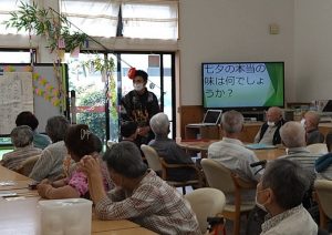 さて、笹も完成したということで、七夕当日なんと、介護員の藤目が浴衣を着て織姫姿で登場、女性利用者様から、お色直しが入り、普段見慣れない衣装に大盛況、で七夕イベントのスタート!まず最初は織姫による「七夕クイズ大会」を行いました。中には七夕の歴史にする難問が出て際には、利用者様の希望にこたえて織姫が体を張ってヒントを出す場面もあり大盛り上がり!今年は雨が降り残念ながら本物の織姫と彦星がみられませんでしたが、利用者様にはイベントを通して七夕を楽しんでもらいました。