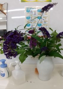 7月も早くも半ばとなりました。今年の梅雨はまだまだ収まりそうにないですが、皆様はいかがお過ごしですか?夏も近づきケアプラス三津では夏の飾りつけも完成し、ブッドレアブラックナイトという珍しい初夏に咲く花をご利用者様におすそ分けしてもらい、すっかり夏模様です♪