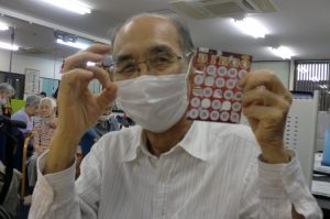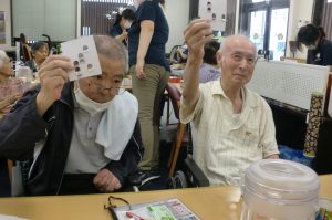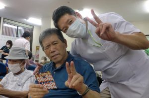 午後からは、ビンゴ大会を行いました。ビンゴ大会は結構人気で、皆さん張り切ってされています。始まる前からソワソワしていて、一番最初が肝心と言われていました。一人ずつ回してもらって、数字を発表すると、あった!!と言われたり、こっちはないよ。と言われる方もおられました。一番最初にビンゴされた方は記念に職員とツーショット!!