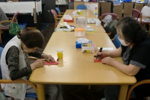 七夕といえば、短冊!まず、利用者様に短冊を書いて頂きました。今年の目標だったり、お願い事を書いてもらい、笹に飾りました。「なんて書こうかしら。」「ひ孫の顔がみたいなぁ」「何書いてもいいのか?」などいろんな声が聞こえてきました。中には職員のことを書いておられる利用者様もおられました。書き終わった後、利用者様同士で「何書いたの?」「私は○○って書いたよ」と楽しそうにお話されていました。