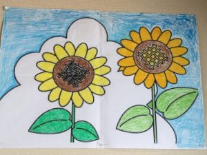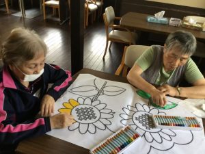 季節の合作塗り絵は今回、クレヨンを使用しました。ヒマワリの色がとても鮮やかで、素晴らしい仕上がりとなりました!