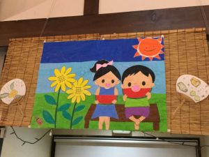 まずは貼り絵。8月のホールを飾る貼り絵は、子供たちが美味しそうにスイカを食べていますね。