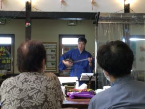 まず、コロナウィルスの影響が静まっていた7月17日金曜日、久方ぶりの外部イベント『嶋本慶 三線コンサート』が行われました。コロナ対策として利用者様方との距離確保とビニールシートの衝立を設置した上での開催です。