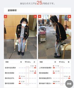 A様は前回測定した際は、立位姿勢を取るのが困難で近くに職員が付いて撮影を行いました。測定結果は25点で、左右の傾きが顕著ですね。