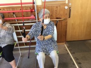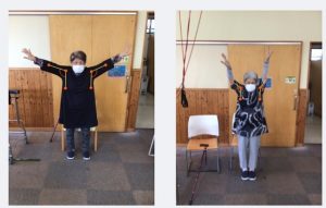 こちらの運動を実施する事で、肩の可動域向上を図っています。