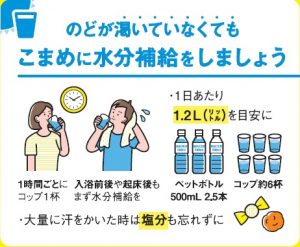 のどが渇いていなくてもこまめに水分補給をしましょう。