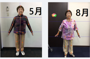 この写真は、姿勢解析システムの写真で、5月と8月に撮影した姿勢を比較したものとなっております。5月よりも8月の方が、姿勢の点数が増加しております。