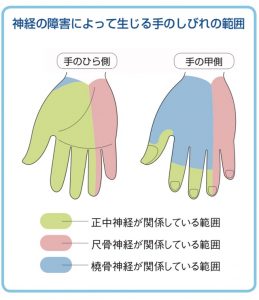 この手のしびれ・・ほとんどの場合が頸部の脊髄・神経根の障害、及び腕から手先まで伸びている3本の末梢神経(正中神経、尺骨神経、橈骨神経)の障害で生じるそうです。その原因は、【怪我】【骨や筋肉、靭帯などによる圧迫】【神経の炎症】【糖尿病】などだそうです。原因がどれであるかは、障害の起こり方、しびれの範囲、運動障害の範囲で決められるそうです。