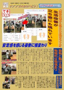 また、重心位置においても中心位置に修正できるまでに至った結果、ご自宅では一人で歩行器を使ってトイレに行くまでに回復し、ズボンの上げ下げを含めたトイレ動作も自立することができました。姿勢においても5月時点に比べ安定した姿勢保持が取れており、バランス機能も含めた体力回復などが図れたことが動きやすい体になったと考えます。