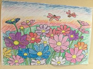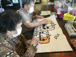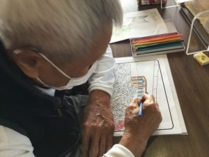 ゲームやビンゴ大会以外の普段の時間にも利用者様は様々な事をして楽しまれています。指先の運動や脳の活性化に繫がるという塗り絵は多くの利用者様が取り組まれています。