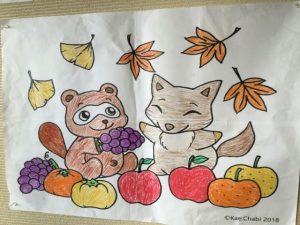 季節の塗り絵の壁飾りはハロウィン、コスモス、秋の動物たち。