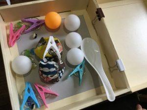 ピンポン球やビー玉は簡単に掬えますが、洗濯バサミやおはじき、豆はなかなか掬いにくいみたいで、皆様、苦労されていました。